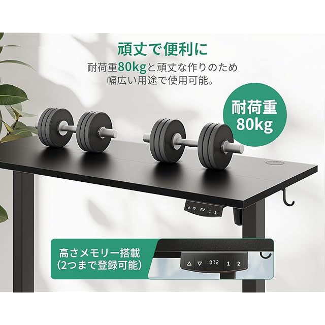 【頑丈設計・耐久性高い】昇降デスクの天板耐荷重は80kgで、パソコンや周辺機器を安心に設置できます。または高強度のメラミン化粧板を採用し、汚れ、キズや熱・水分に強く、長持ちしやすいです。フレームは上質な炭素鋼で作られ、通常の鋼材よりも丈夫で変形しにくいです。更に、机の丈夫さを上げるために脚をアップグレードしました。頑丈な脚は机の安定性をよりよく確保することができ、昇降の最大高度ても天板をしっかり安定させ、揺れにくい!