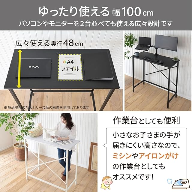 【立ったままの作業にオススメ】立った状態での作業がスムーズに進む天板高さ約100cmのデスクです。パソコンを置いてもメモを取ったりするスペースを確保できる幅100cmです。