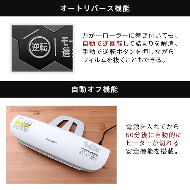 【機能】:オートリバース,ヒーターオートオフ,温度調節【ローラー本数】:4本 【加工時間(A4/1秒)】:56秒(50Hz)・47秒(60Hz)