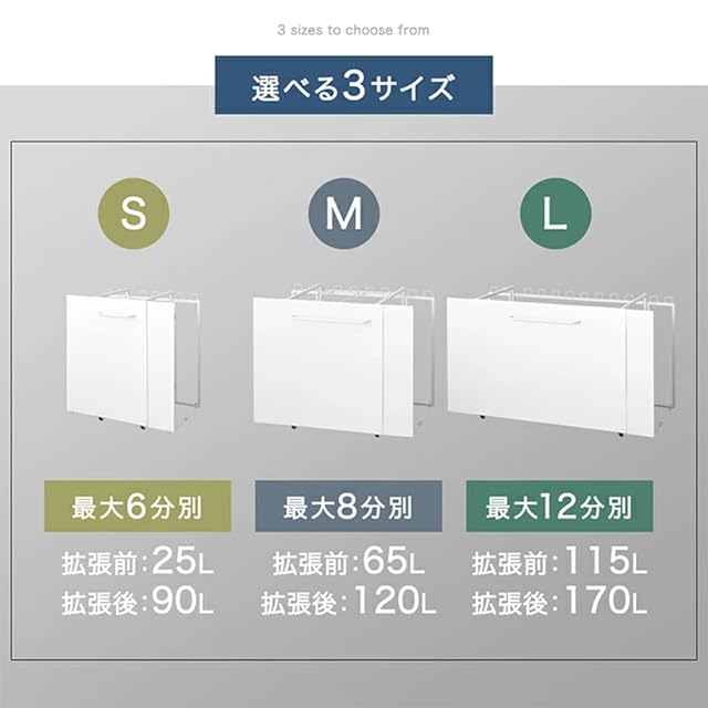 【スタッフのおすすめポイント】・最大6/8/12種類の分別が可能・ゴミの量に合わせて拡張OK・底板は袋のストック置き場として・平袋型にも対応!ごみ袋ストッパー付・床を傷付けにくいPUキャスター
