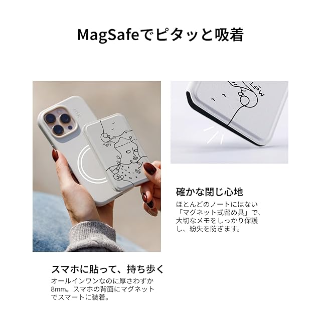 【MagSafe対応、超薄型デザイン】Magsafe対応でスマホに楽々着脱可能です。またマグネット吸着でしっかり閉じて、大切なメモを落としません。多機能でありながら、厚さはわずか8mmです。