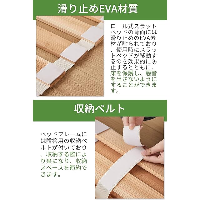 【素材】すのこベッド本体:天然杉/キズ防止クッション材:EVA樹脂。当すのこベッドには、厳選された天然杉を使用しております。爽やかで心地よい木の香りが広がり、癒しの空間を演出します。天然杉には、調湿・防虫・抗菌・断熱といった優れた天然の効果があり、一年を通して快適な眠りをサポートします。