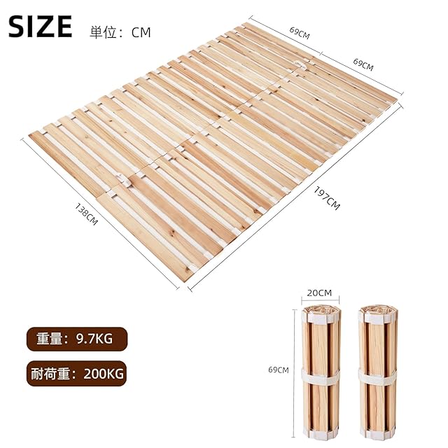 【仕様】ロール式 ダブル すのこベッド展開寸法:約幅138×奥行き197×高さ1.4cm、 梱包サイズ:約幅29.4×奥行き70.5×高さ14cm。商品重量:約9.7kg