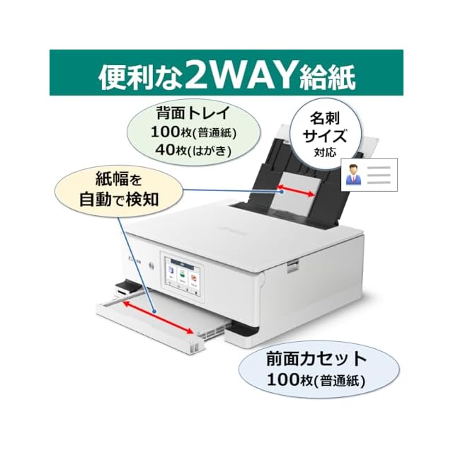 給紙:前面カセット給紙(A4普通紙100枚)、背面給紙トレイ(A4普通紙100枚)