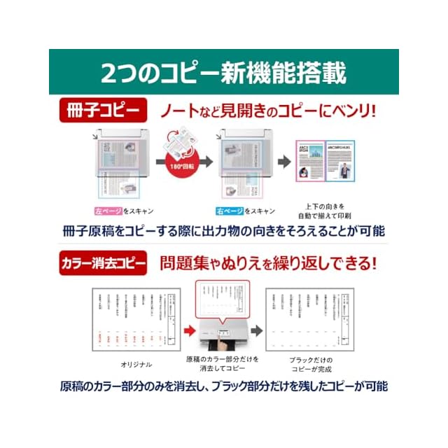 製品特徴:低ランニングコストで高機能、幅広いおうちプリント需要に応えるモデル。新しいコピー機能(色消しコピー・冊子コピー)搭載。