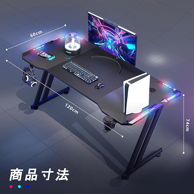 LEDゲーミングデスク「メーカー一年」幅120 cm×奥行60cm Z字フレーム炭素繊維天板pcデスクカップホルダーとイヤホンフック付きパソコンデスクブラック