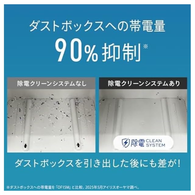 【除電クリーンシステム(TM)】なら、特殊構造が細断くずの静電気を除電し、ダストボックスへの張り付きを抑えます。(ダストボックスの帯電量を従来機種に比べ約90%抑制※)※ダストボックスへの帯電量を当社従来機種「OF15M」と比較。アイリスオーヤマ調べ。