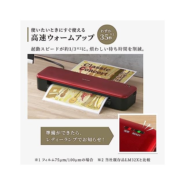 アイリスオーヤマ 高速起動ラミネーター 名刺サイズ~A3 立ち上げ時間35秒 4本ローラー 対応フィルム 75μm~150μm ラミネーター 高速 フッ素加工 よれない コンパクト レッド 赤 KHSL-A342-R