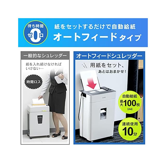 アイリスオーヤマ オートフィードシュレッダー シュレッダー 業務用 クロスカット 4×10mm 自動細断最大100枚 A4用紙最大200枚収納ダストボックス AFSR100C ホワイト