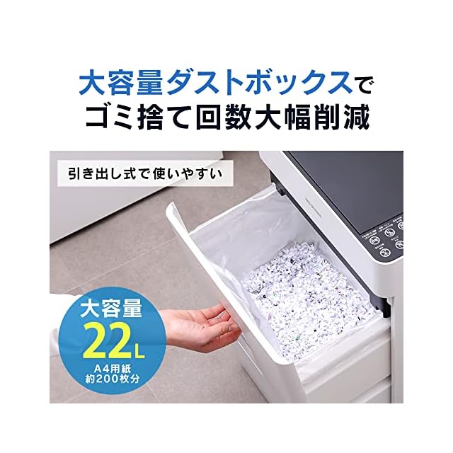 細断サイズ:クロスカット 約4×10mm●細断速度:約2.1m/分●最大細断枚数:A4コピー用紙(上質紙64g/平方メートル) 9枚