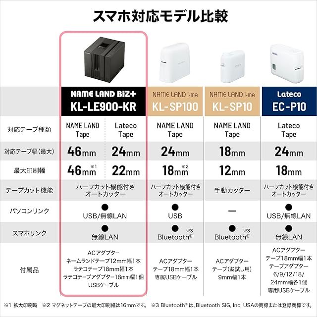 【対応テープ幅】ネームランドテープ 3.5/6/9/12/18/24/36/46mm、ラテコテープ 6/9/12/18/24mm 【最大印字幅】ネームランドテープ 46mm、ラテコテープ 22mm 【最大印字行数】ネームランド 21行、 ラテコ 11行