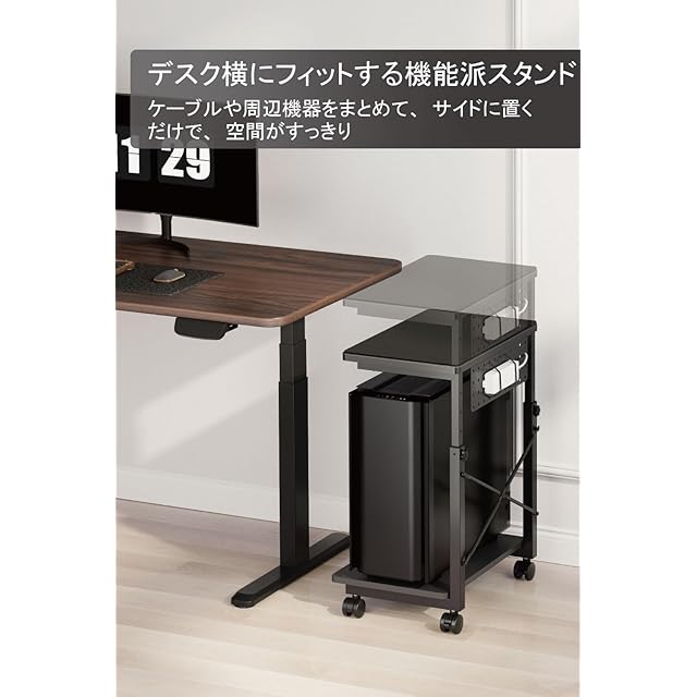 商品名:Alterzone 高さ調整可能 PCワゴン・パソコンラック キャスター&アジャスター付き ゲーミングPC・複合機対応 サイドデスク・プリンター台 袖机 パソコン収納 昇降式L字デスク PC置き台 移動便利 ブラック ALZ-CPU1