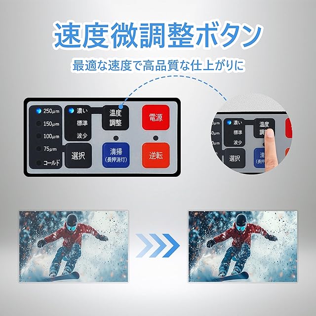 【柔軟な温度調整機能】用紙やフィルムの厚さ・色味に応じて温度を細かく調整可能。厚紙や濃色の印刷物でもムラや気泡を防ぎ、写真や重要書類を美しくクリアに仕上げます。仕上がり品質がワンランク上がり、プレゼン資料や掲示物にも最適です。