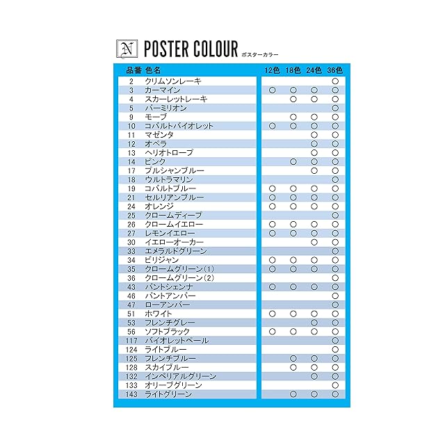 セット内容:3カーマイン、10コバルトバイオレット、19コバルトブルー、21セルリアンブルー、24オレンジ、26クロームイエロー、27レモンイエロー、34ビリジャン、35クロームグリーン(1)、43バントシェンナ、51ホワイト、54ブラック、4スカーレットレーキ、9モーブ、14ピンク、124ライトブルー、125フレンチブルー、143ライトグリーン、11マゼンタ、12オペラ、17プルシャンブルー、30イエローオーカー、53フレンチグレー、132インペリアルグリーン