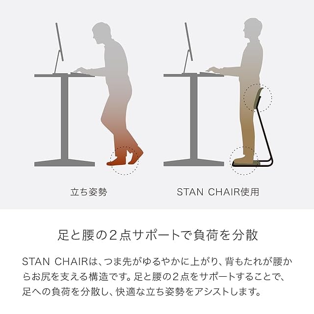 ①足と腰の2点サポートで負荷を分散 STAN CHAIRは、つま先がゆるやかに上がり、背もたれが腰からお尻を支える構造です。通常の立ち姿勢では足に負担がかかりますが、STAN CHAIRでは足と腰の2点をサポートすることで、足への負荷を分散し、快適な立ち姿勢をアシストします。