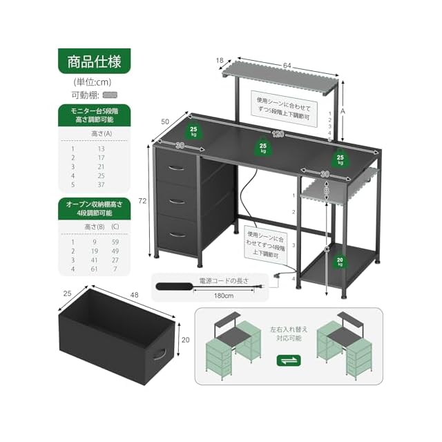 LunarLight パソコンデスク ゲーミングデスク モニター台高さ調節可能 コンセント付き 引き出し3杯 勉強机 机 pcデスク ワークデスク オフィス 左右入れ替え対応 棚高さ調節可能 computer desk テレワーク 収納たっぷり 書斎 (カーボンファイバーブラック, 幅120×奥行き50×高さ84.5-108.5cm)