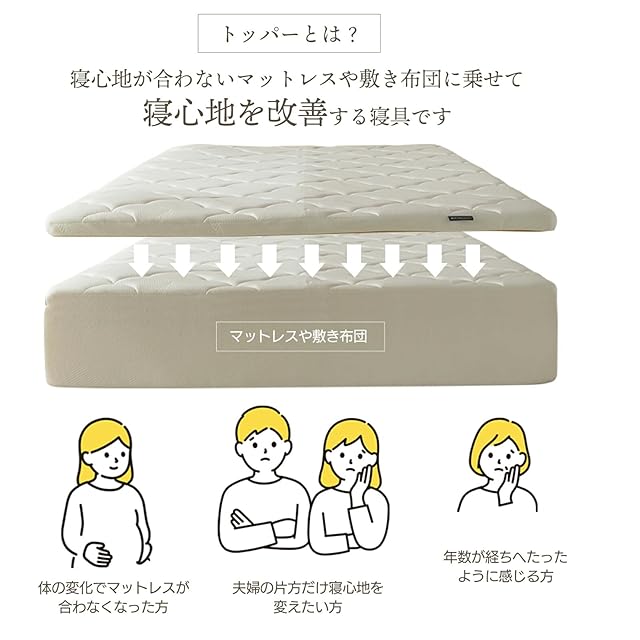 ★寝心地が合わないマットレスや敷き布団に乗せて寝心地を改善する寝具です。いつものマットレスに重ねるだけでほっとするような寝心地に。