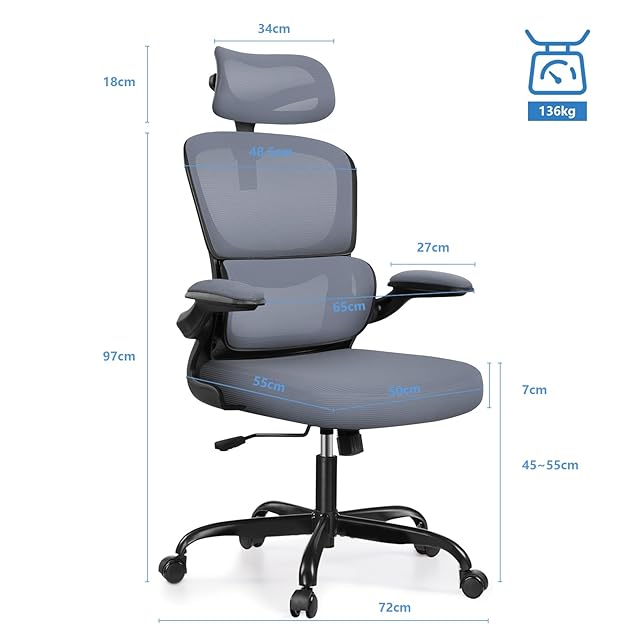 【通気性・快適さ】背もたれ・座面共に通気性に優れたメッシュ素材が使用されます。メッシュの弾力性が背中にフィットし、厚い座面は快適さをもたらします。可動式ヘッドレストも首の疲れを取ります。