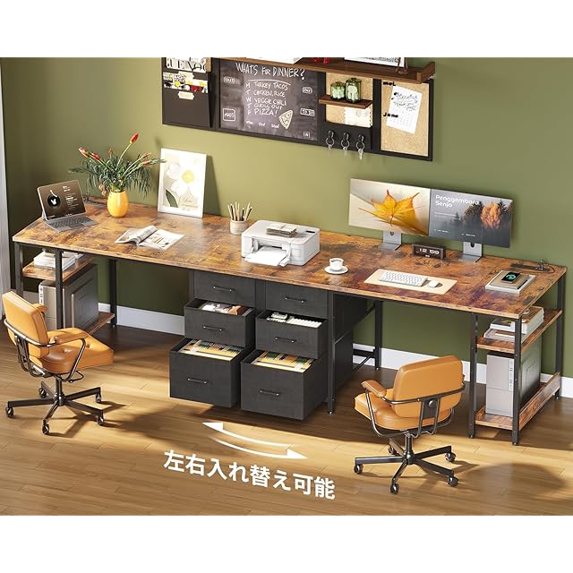 【両側収納力満載、多サイズの物の収納に適する】①ラックには棚板が2段あり、置くものに合わせて上段の棚板の位置が調節可能です。下段の棚板はCPUシェルフで、PCケースなど大きなものは収納できる。お好みに合わせて、ラックの部分は左右どちらにも設置OK。限られたスペースで効率的な収納を実現しています。②布製の引き出し3杯からなるキャビネットのような収納空間は限られた空間で収納効率が大幅にUP。MDFボードを内蔵した引き出しは重い物を入れても変形しにくい。同時にプライバシーを保護し、ほこりが落ちるのを防ぐ。小物から書類、本、アクセサリーまでたっぷり収納可能。さらに、3段目の引き出しには通常より大きく、大型アイテムやA4ファイルなどお気に入りの雑貨も美しく収められます。散らかりがちなデスク周りをスッキリ整頓し、作業に集中できる空間を提供します。