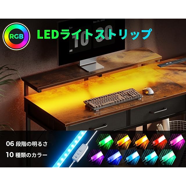 AODK L字デスク ゲーミングデスク パソコンデスク 100cm幅 コンセント付き RGBライト付き モニター台付き 棚高さ調節可能 右棚左棚 大型PCデスク 収納力 引き出し2杯 オープンシェルフ設計 作業&ゲームに最適 ゲームデスク ビンテージ