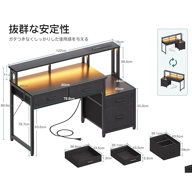 【限られたスペースでも究極な収納を実現】中間収納+一体型のチェスト+超長い机上台+フックが備わっている。多様な収納設計で、さまざまなサイズの物の収納に適している。MDFボードを内蔵した布製の引き出しは重い物を入れても変形しにくい。プライバシーを保護し、ほこりが落ちるのを防ぐ。作業と収納のエリアを明確に区切るし、足下の空間も十分(幅75.8×高さ63.5cm)だし、効率的で快適に働く。