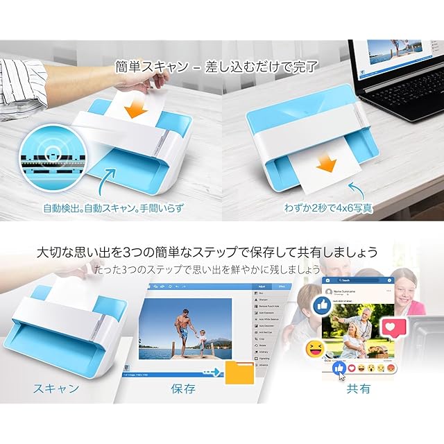 KG判 (4x6) の写真 1 枚で 2 秒、A4サイズ (8x10)の写真 1 枚で 5 秒 @300dpi。 約 1000 枚の写真を簡単に変換してファイルをデジタル化し、家族や友人と 共有できます。