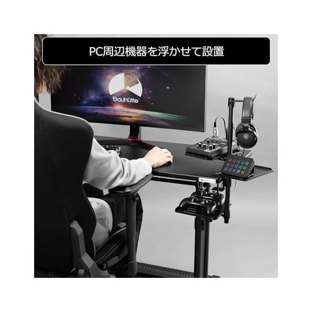 【デバイスを浮かせて収納】クランプ固定式の収納スタンドです。オーディオインターフェースなどの周辺機器3つ+ヘッドセット1つを、いつでもサッと手に取れるポジションへと配置可能です。