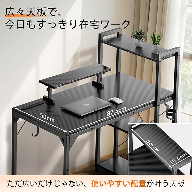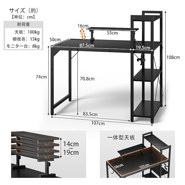DOMICON ゲーミングデスク コンセント付き 幅107CM 棚付き 収納 モニター台付き パソコンデスク pcデスク オフィスデスク 学習机 作業机 computer desk 电竞桌 おしゃれ 組立簡単 黒