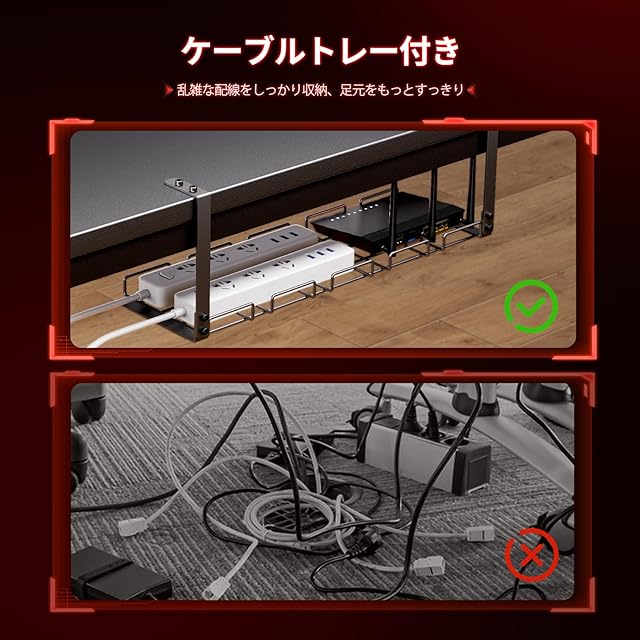 ✅【コンセントと配線トレー付き】パソコンデスクにはケーブルトレーが搭載されており、配線をすっきり整理できます。掃除時も簡単に清掃できるので、快適な作業環境を維持できます。スライドカバー付きのコンセントで、スマホなどの電源を確保しつつ、誤操作にも確実に防止します。