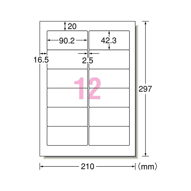 A4判 12面/シートサイズ:A4判 (210mm×297mm)/ラベルサイズ:90.2mm×42.3mm(2列×6段)