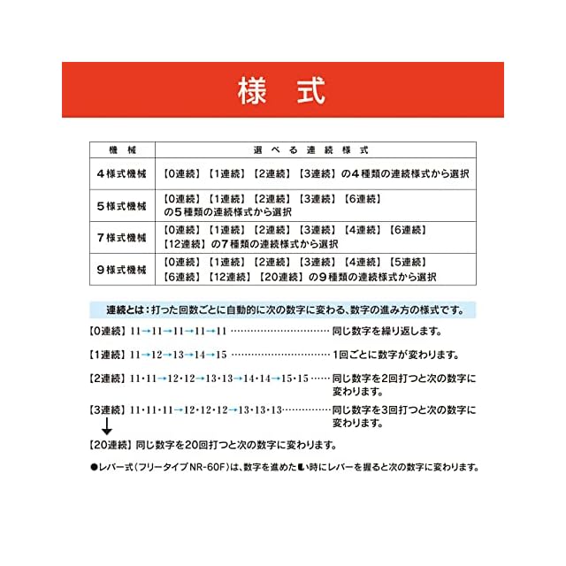 仕様:5桁4様式(同一番号繰返し、連続、2連続、3連続打ち)