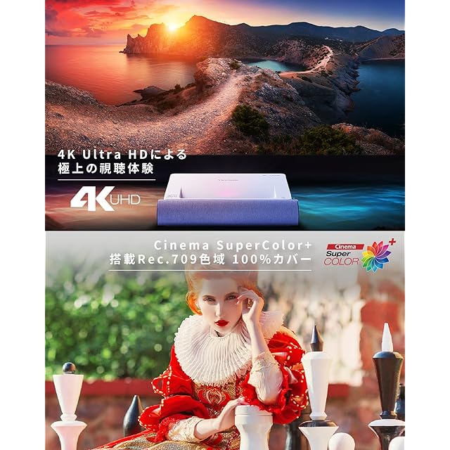 【Rec.709完全対応、Cinema SuperColor+テクノロジー搭載】X2000L-4Kは、ViewSonic独自のCinema SuperColor+テクノロジーにより、100%のRec.709色域*をカバー。これにより、驚くほど鮮やかでリアルな色彩を再現し、圧倒的な没入感を実現します。自然な色調から鮮烈な色彩まで、映画製作者が意図したままの色彩世界を、ご自宅で存分にお楽しみいただけます。高精細な4K解像度と相まって、まるで実際にその場にいるかのような臨場感あふれる視聴体験を提供します。