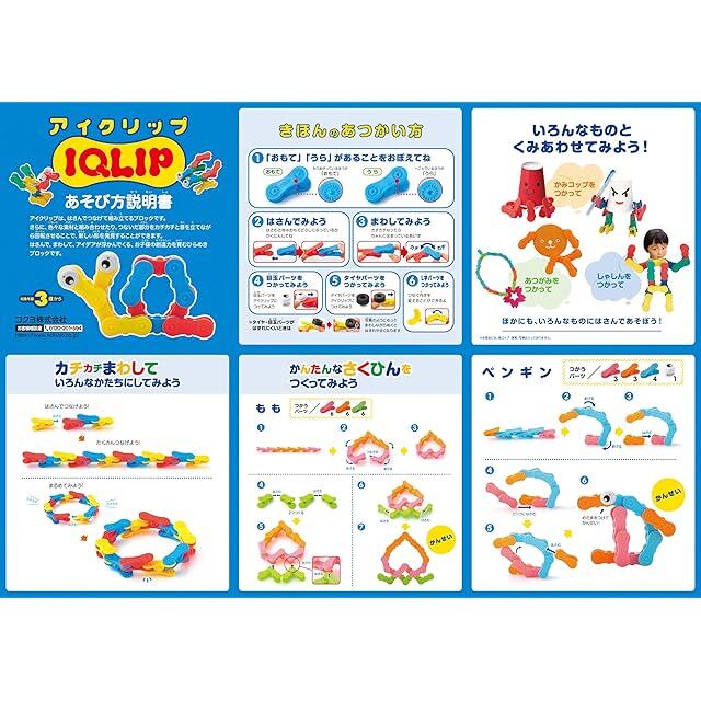 【セット内容】アイクリップ(80個):赤・黄・緑・青・ピンク・オレンジ・ライトブルー・ライトグリーン×各10個、L字パーツ(12個):赤・黄・緑・青×各3個、目玉パーツ・タイヤパーツ×各10個、遊び方説明書