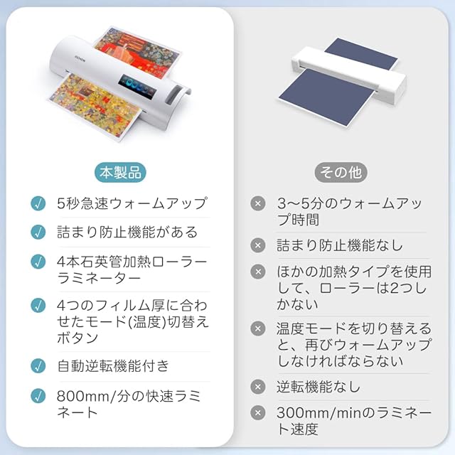 【コンパクトデザイン】ラミネート機はA4*5枚、A3* 5枚のラミネートフィルム、クリーニングシート1枚が付属され、届いたらすぐ使えます。ラミネート機はコンパクトだから、デスク隅にしまっておいても、デスクを圧迫しないスリムサイズです。自宅でもオフィスでも、a3ラミネート本体をスッキリ収納します。気楽に学校/オフィス/自宅で安全作業できます。ラミネート加工機で大切な写真の長期保存や、しおり・ポスター・メニュー表作りに便利です。