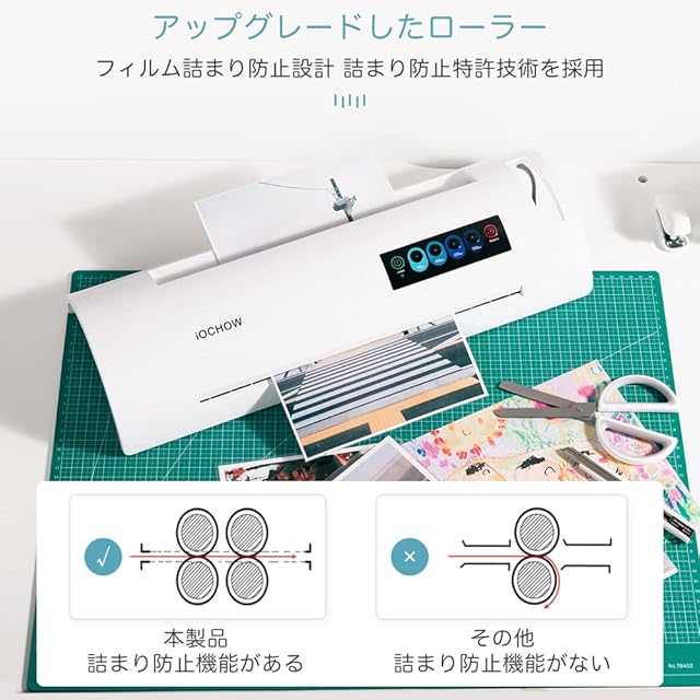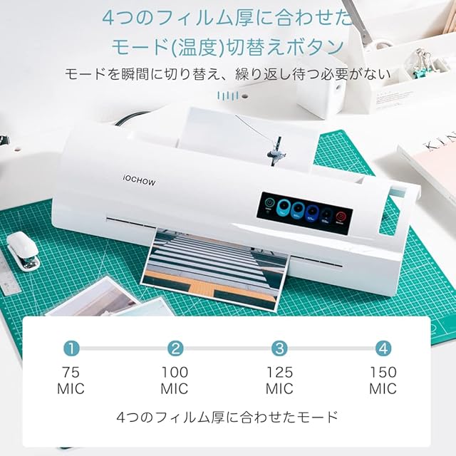 商品名:iOCHOW ラミネーター パウチラミネーター ラミネート パウチ:最大A3対応 5秒間ウォームアップ 高速起動 気泡なし 波打ち防止 75-150μmフィルム対応 温度調節機能付き 詰まり防止 60分連続作業可能 家庭用 業務用 オフィス用 A4/B5/ハガキ/名刺