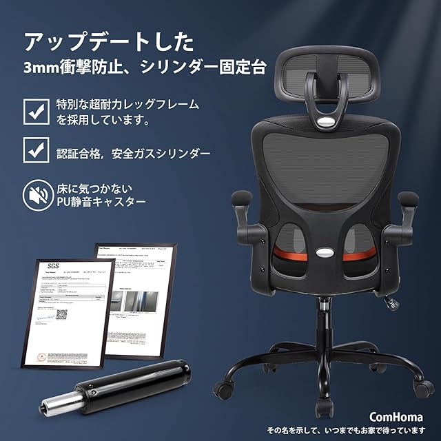 ComHoma デスクチェア オフィスチェア 椅子 テレワーク 疲れない pcチェア メッシュ 人間工学 ランバーサポート 跳ね上げ式アームレスト 腰が痛くならない130°ロッキング機能付き 在宅ワーク 在宅勤務 形状記憶ポリウレタンクッション材【3段階昇降・反発力ある背もたれ 腰ラク】black