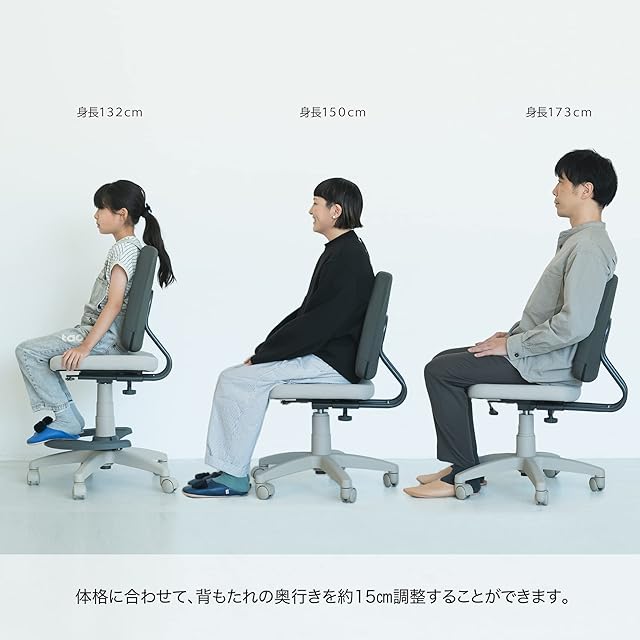 【人間工学に基づく・イトーキ独自の傾斜スライド機能】背もたれを斜めに動かす傾斜スライド機能は、座面奥行と背もたれの高さを同時に調節できるので、お子さまの成長に合わせて背もたれの固定位置を無段階で調節可能。(スライド幅:最大8cm)膝裏の圧迫感を軽減し、腰部をしっかりサポートしてくれるので、座った姿勢をきれいに保つことができます。