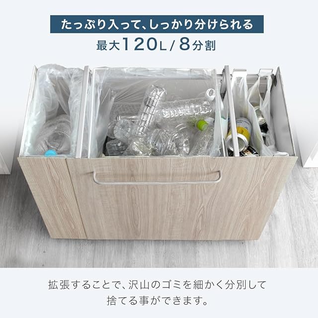 【スタッフのおすすめポイント】・最大8つの分別が可能<br> ・お部屋に馴染む木目調・ゴミの量に合わせて拡張OK・取り外し可能!ゴミを隠せる側板・底板は袋のストック置き場として・平袋型にも対応!ごみ袋ストッパー付・床を傷付けにくいPUキャスター