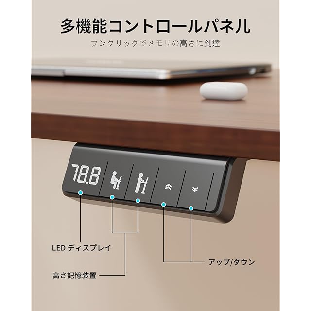 【誰でもカンタン操作!初めてでもすぐ使える】操作パネルはシンプルで直感的に使えるデザイン。2つの高さを記憶できるメモリーボタン付きで、毎回の調整が不要に。ワンタッチで自分にぴったりの高さに調整できるため、初めて電動昇降デスクを使う方でも安心。家族で共用する場面にも最適です。
