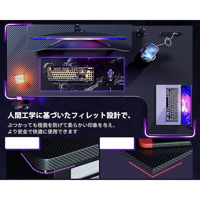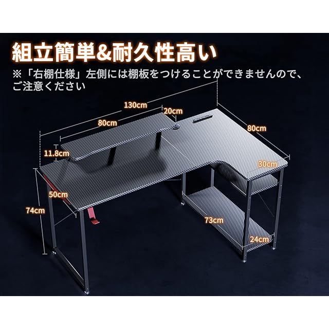 【ゲーム機能満載】E‐スポーツが流行っている現在、クールでカッコいいl字デスクはゲーマーにとっては最高の物です。塗装ではなく剥がれにくいし、カーボン調の天板がグッとゲーミング感を高めてくれます。便利な回転フックと配線孔付きで、ごちゃごちゃした配線、バッグやヘッドフォンなどを綺麗に収納できます。