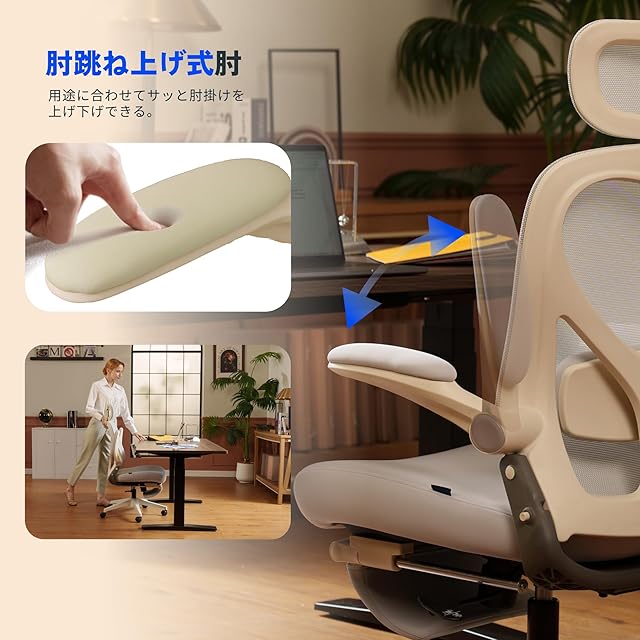 【跳ね上げ式肘・3Dヘッドレスト】椅子に座るときには肘を下ろして使用でき、椅子に座らないときには肘を跳ね上げてデスクに収納できる。また、用途に合わせてサッと肘掛けを上げ下げできる。3Dヘッドレストは、前後・上下・角度が調節可能で、頭と首を快適に支えましょう。