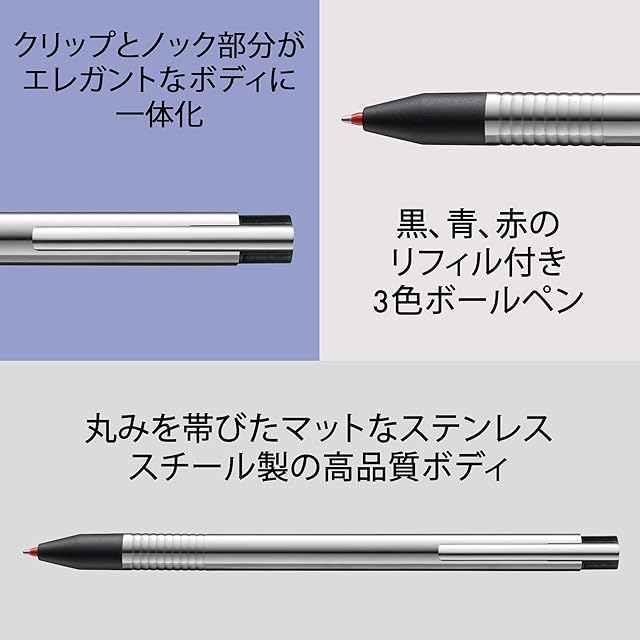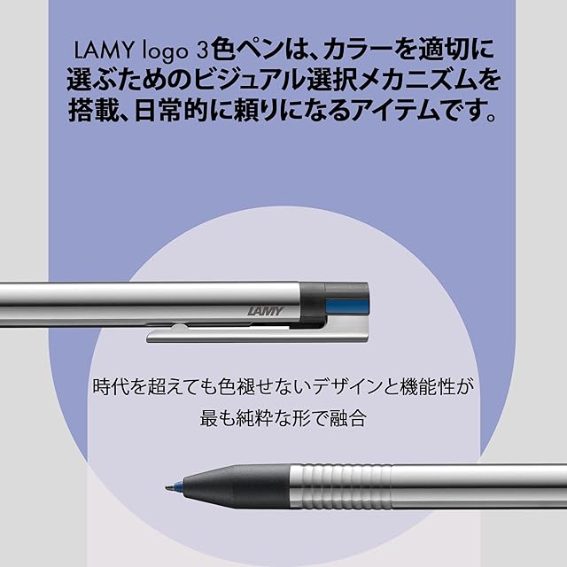 3 IN 1:LAMY ロゴのマルチカラーボールペンは、マルチシステムペンであり、頑丈で錆びないステンレス製のエレガントで時代を超越したボディに、3色の異なる色のリフィルを組み合わせています。