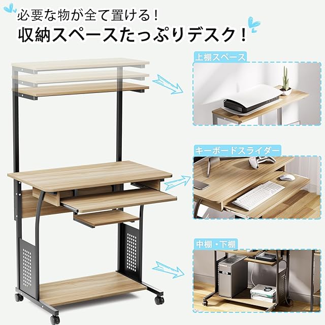 DEWEL パソコンデスク 机 pcデスク パソコンラック 収納ラック付き 木製 テーブル 木目柄 キャスター キーボードテーブル付き PCラック 省スペース シンプル メラミン加工 ワークデスク学習机 80X50X135cm (ナチュラル+ブラック)