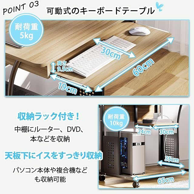 【広く、省スペース】★天板:パソコン操作に十分な広さ、ゆったり快適に使えます。★中棚:中棚にはゲーミングヘッドセット、ルーター、DVD、本などを収納できる小さな取り外し可能な収納ラックが配置できます。★キーボードスライダー:キーボードや小物を置けます。スリムなのに収納力が抜群で場所が取らないです。ちょっとしたスペースがパソコンコーナーに早変わり、作業効率がぐんぐん上がります。ご自宅ではもちろん、オフィスでも大活躍!在宅勤務やゲームのプレイに最適です。