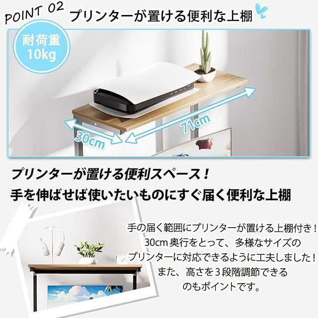 【縦の空間を有効活用】★上棚:上棚スペースにはインクジェットプリンタなどのパソコン周辺機器を置くことができます。体格やモニタの高さに合わせて、7センチ間隔で3段階調節可能です。手を伸ばせば使いたいものにすぐ届く便利な上棚です。★下棚:パソコン本体やルーター、A4フャイルと書類を収納でき、足元のスペースを有効活用できます。