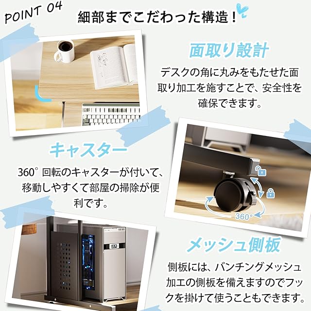 【移動便利&横揺れ防止】★このパソコンデスクは360°回転のキャスターが付いて、移動しやすくて部屋の掃除が便利です。ストッパーも付いて、デスクが滑るのを防ぎます。ねじを紛失する恐れがあるため、予備ねじ(余る)が用意されています。予めご了承ください。★木板とスチール製のフレームで横揺れを抑えるだけではなく、パソコンデスクの強度も増し、快適にお使いいただけるローデスクです。