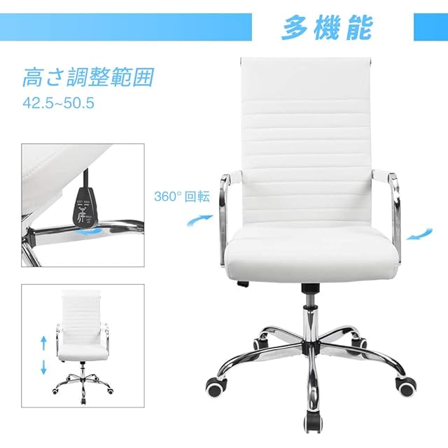 [多機能]ロッキング機能、仕事の合間に、ゆったりとくつろぐことができます。高さ調整機能、デスクに合わせて椅子の高さを自由に調節できます。キャスターが360度回転可能、椅子を簡単に動かして同時に複数の仕事を切り替えたりすることができます。