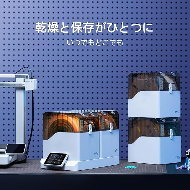 【自動乾燥】E1ドライヤーボックスは高精度湿度センサーを内蔵し、内部の湿度をリアルタイムに表示。フィラメント乾燥機がスタンバイ状態でも、内部の湿度が50%以上になると自動的に作動し、二次的な湿気への暴露を防ぎます。そのため、フィラメント保管ボックスとしても使用できます。