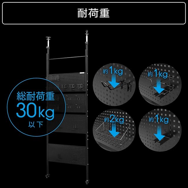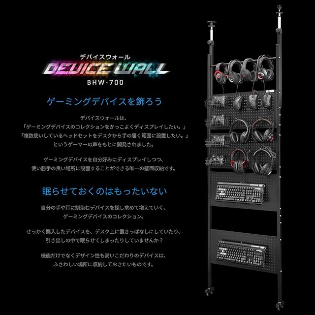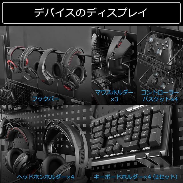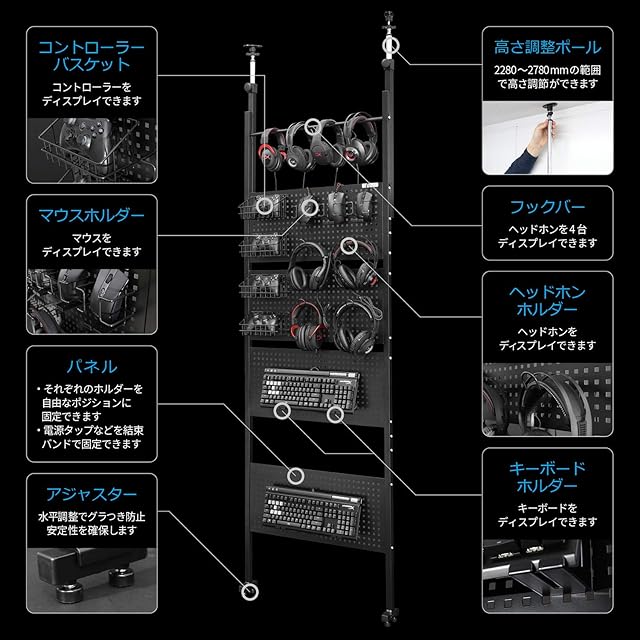 【スペック】サイズ:幅70×奥行10×高さ228~278cm / 耐荷重:30kg(バスケット:2kg、各種ホルダー:1kg) / 付属品:マウスホルダー*3、コントローラーバスケット*4、ヘッドホンホルダー*4、キーボードホルダー*4 / 材質:金属(スチール)