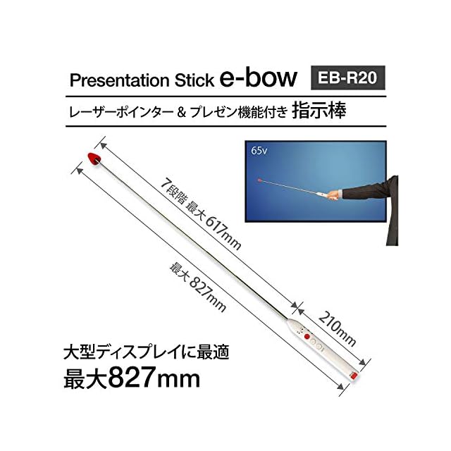 【品番】e-bow EB-R20【外形寸法】W210~W827×D28×H26mm (指示棒のみ :617mm/7段階伸縮)【質量】約115g(電池含む)